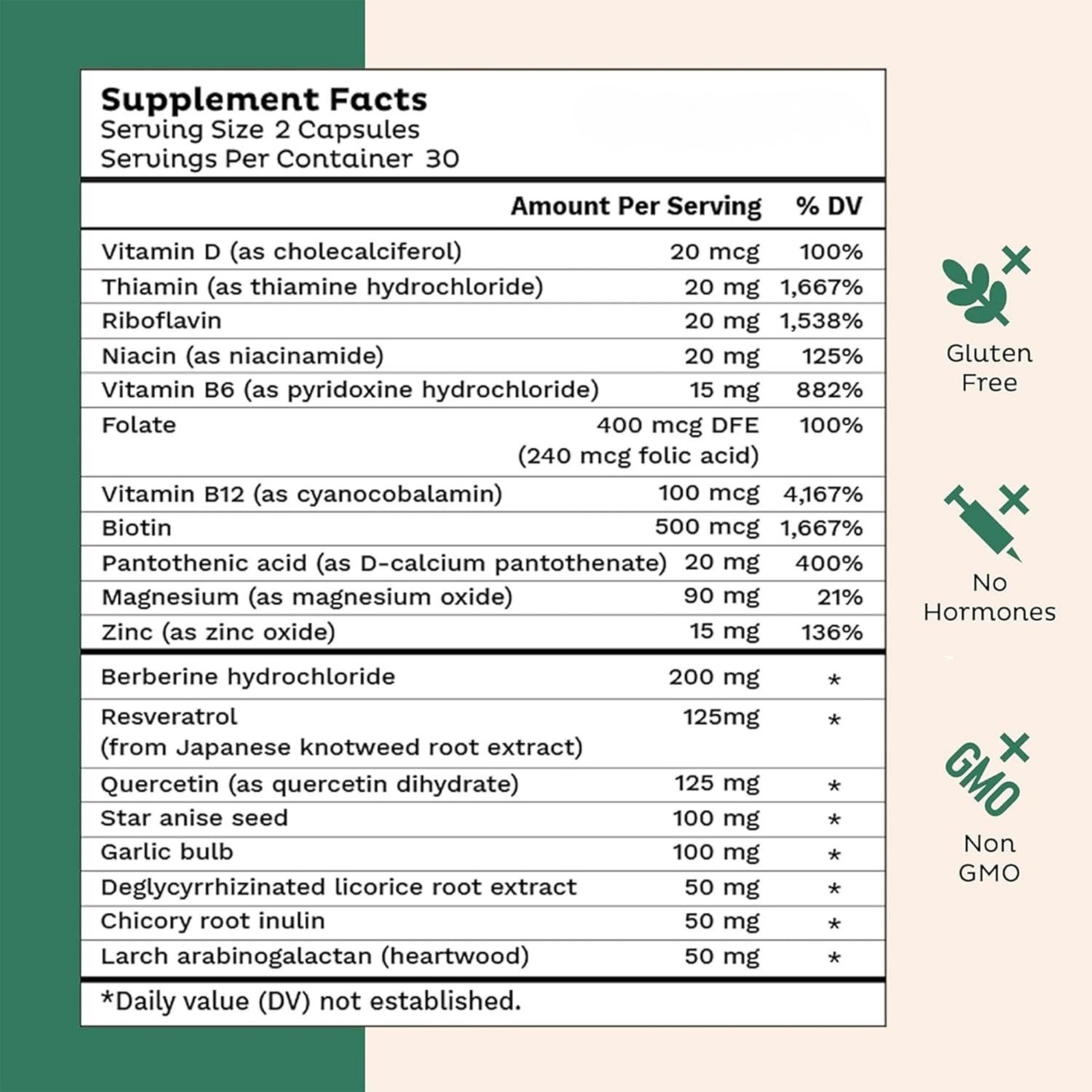 Take 2 capsules daily with a meal—preferably breakfast or lunch. Taking with food improves absorption and reduces any stomach sensitivity. Most customers take both capsules in the morning with their Metformin (if applicable). You can split into 1 capsule twice daily if preferred. Start with 1 capsule daily for the first 2-3 days if you're sensitive to new supplements, then increase to the full 2-capsule dose.